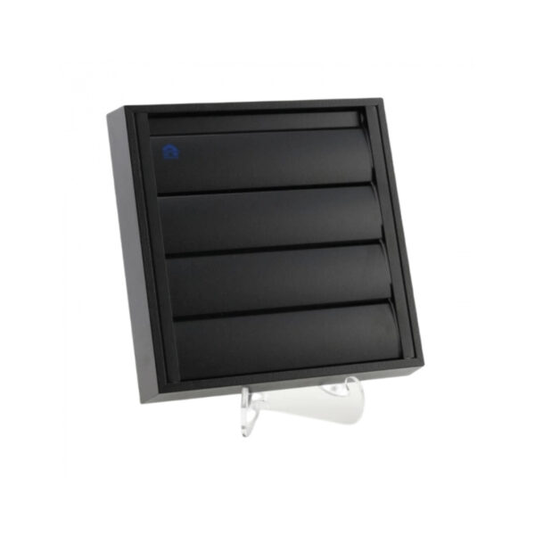 A grelha de sobrepressão de 210 × 210 mm da marca de qualidade Renson é feita em perfil de alumínio AIMgSi 0.5 e pintada em RAL9005 preto, sem rede anti-insetos. As lâminas estão mecanicamente ligadas e abrem e fecham em conjunto para reduzir o ruído. Estão integradas na moldura de alumínio, impedindo que o vento as mova quando estão fechadas (em condições meteorológicas normais). A grelha é fornecida com parafusos e buchas e dispõe de fixações ocultas. A altura total é de 29 mm.